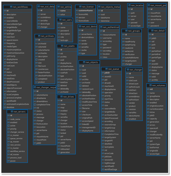 nxn_volumes | `vid`, `name`, `groupName`, `description`, `enabled`, `originalLocation`, `currentLocation`, `inUse`, `jobID`, `capacity`, `generation`, `errors`, `spaceLeft`, `changer`, `modificationBy`, `serverName`, `pid`, `systemType`, `lastFormat`, `originalId`, `directAccess`, `uuid` | This table contains a list of all ‘volumes’ within the system, whether they be tape, disk, ALTO or S3 etc. The queue uses the table to ascertain whether a certain job might succeed if it were executed. In order to do this the queue looks at the locked status, capacity and group within which the volume is contained. All of which is available from this table. |