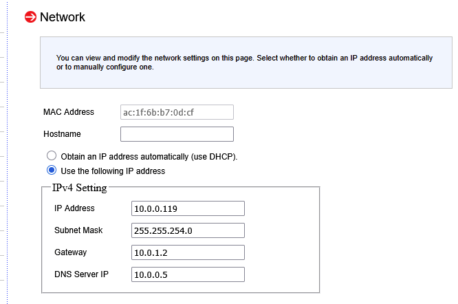Under the Configuration menu, select network. Change the IP address, subnet mask, gateway, and DNS server if applicable. You can also choose to obtain an address from a DHCP server.